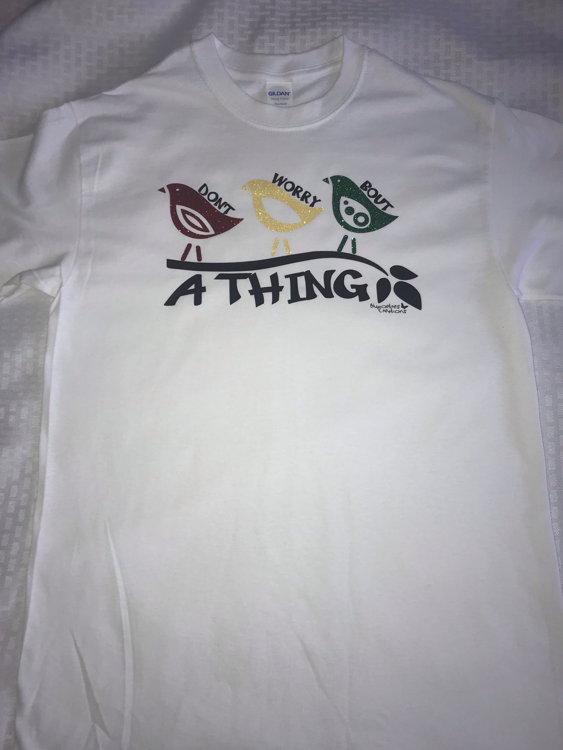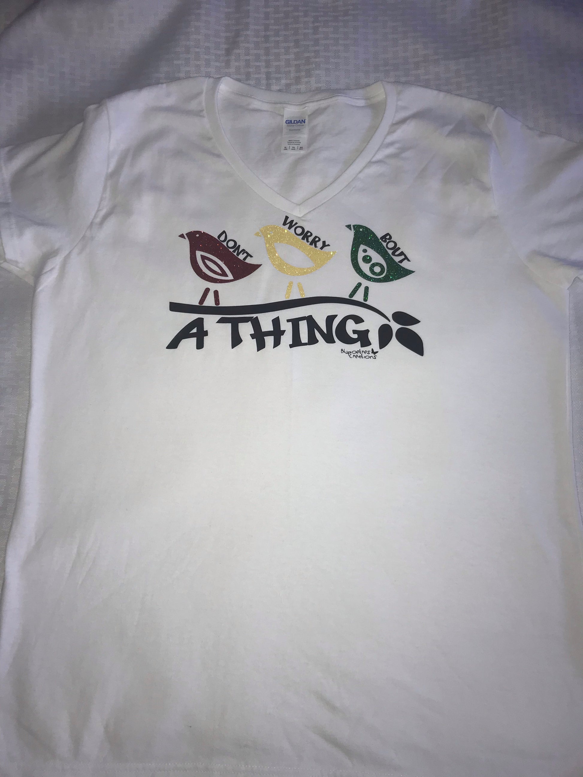 Available in classic cut or V-neck white T-shirt with red, yellow, and green birdies and black lettering or with glittered birds.