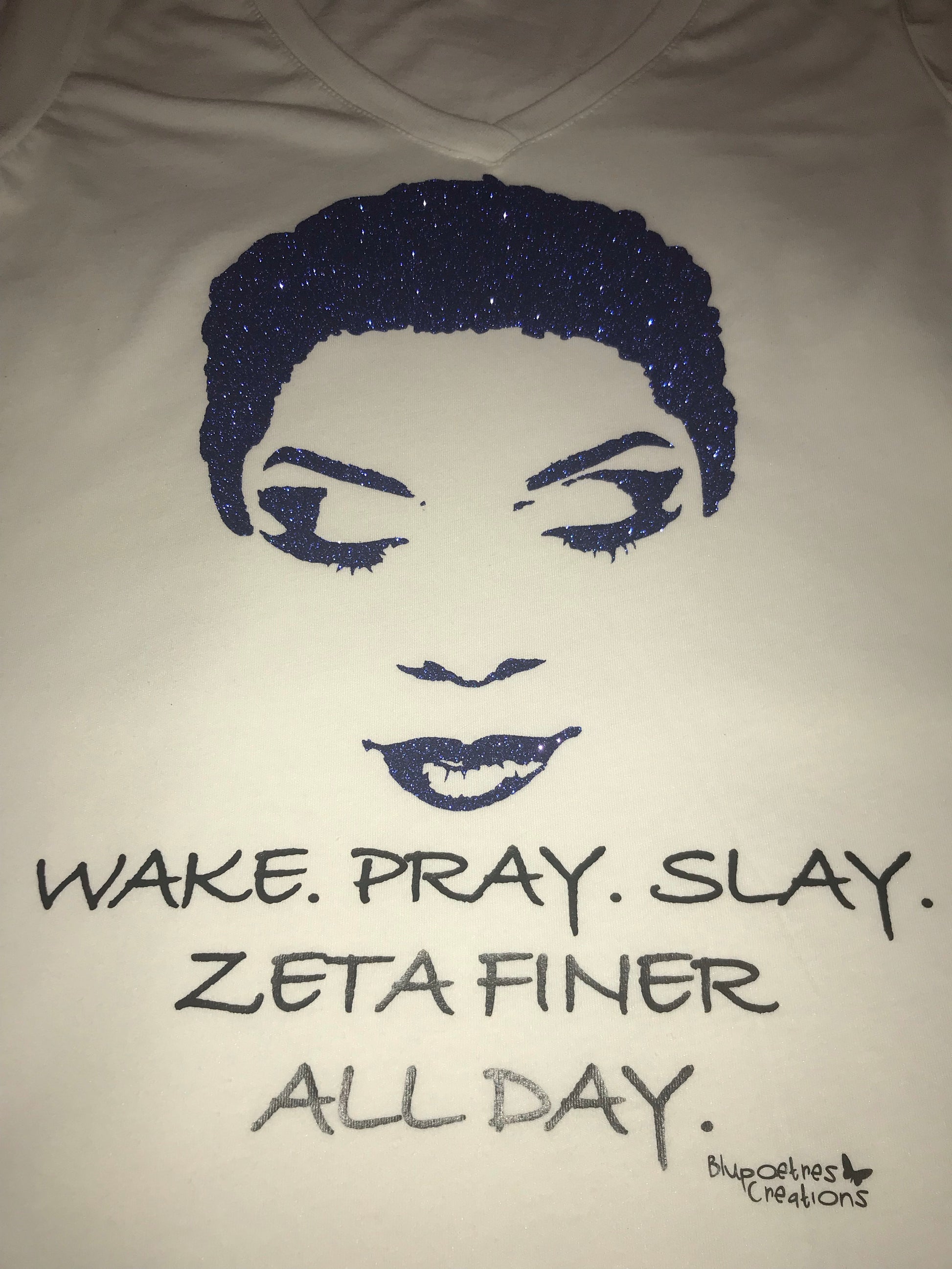 Ladies cut white V-neck T-shirt with Royal Blue glitter hair and face and black lettering